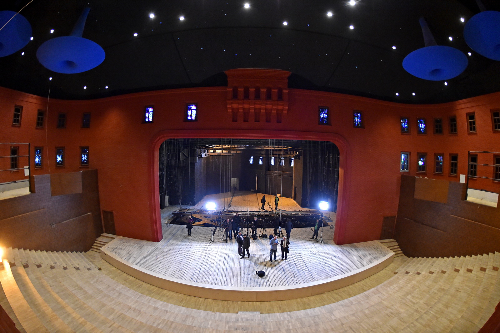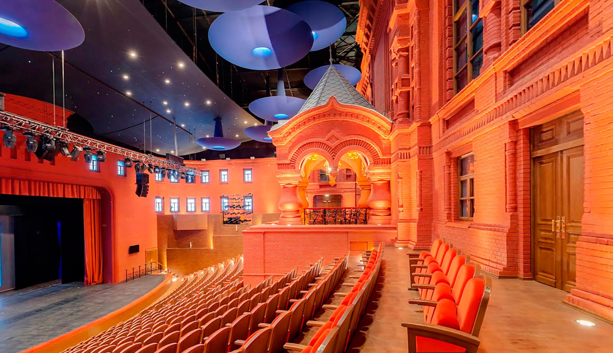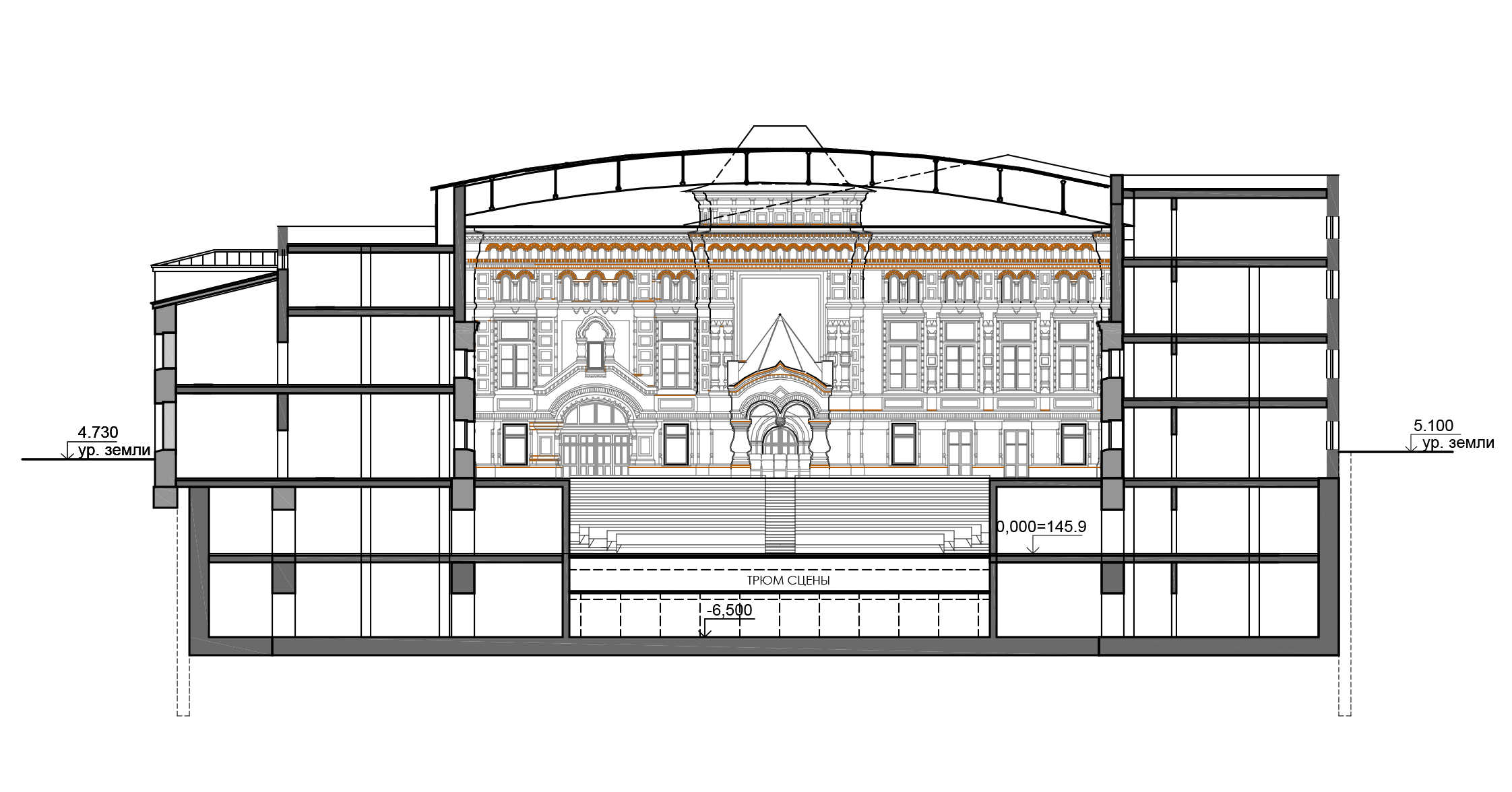 Проектом предусмотрено устройство нового зрительного зала в перекрытом внутреннем дворе усадьбы, организациия нового сценического комплекса – в служебных постройках, размещение зрительских помещений – в главном здании усадьбы.