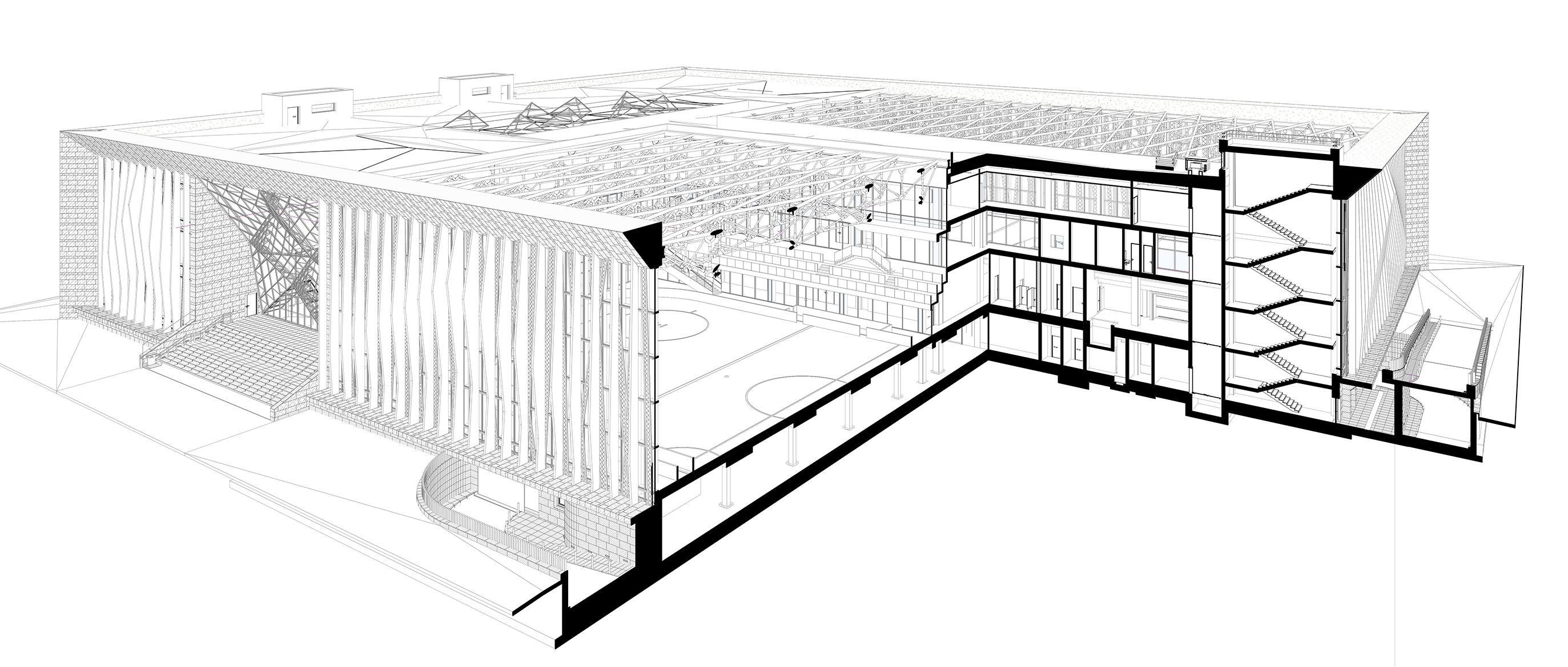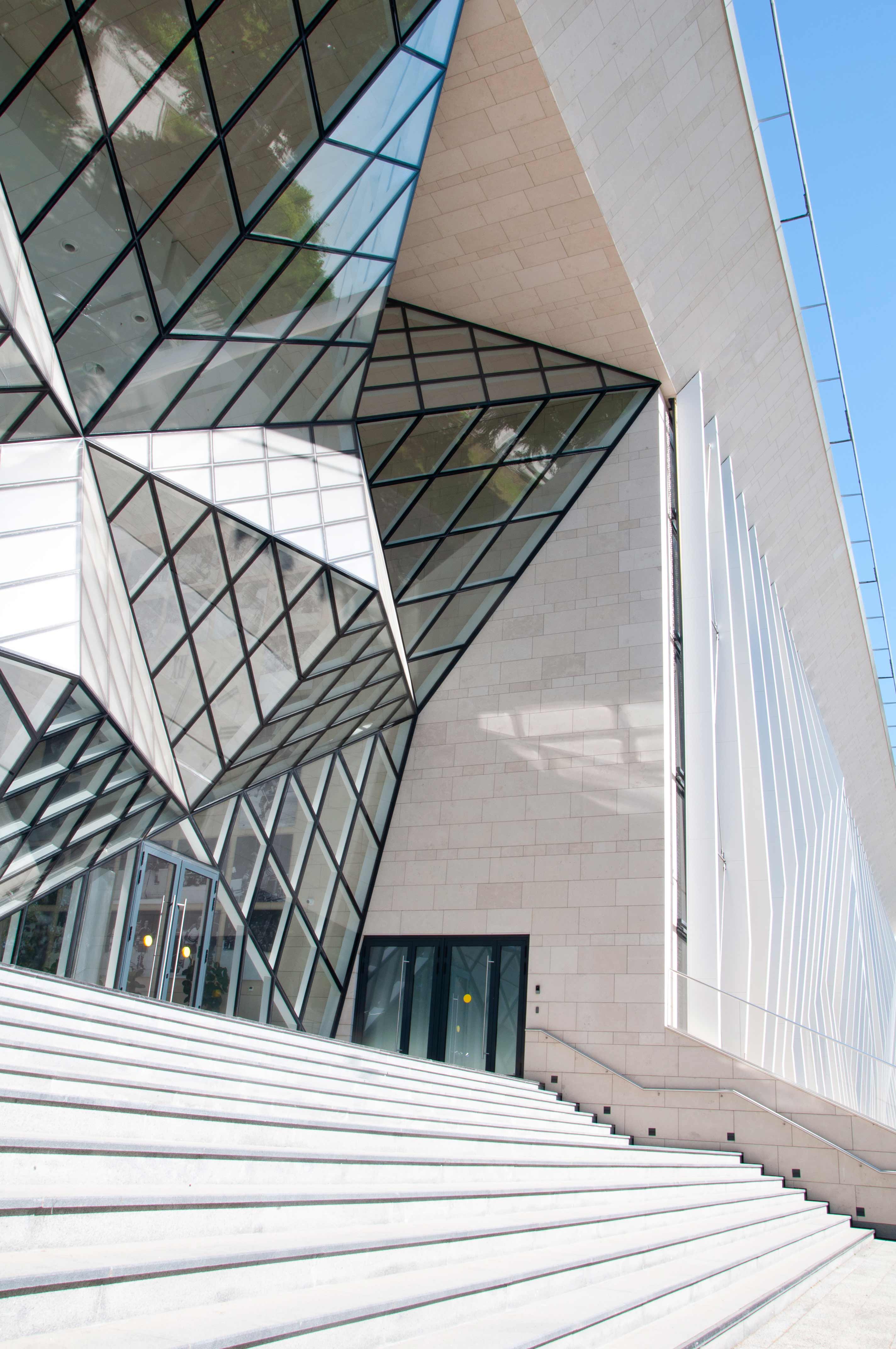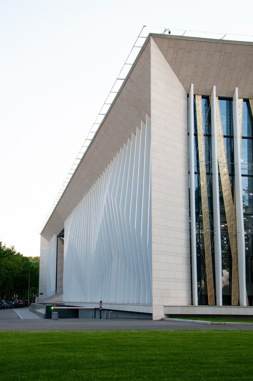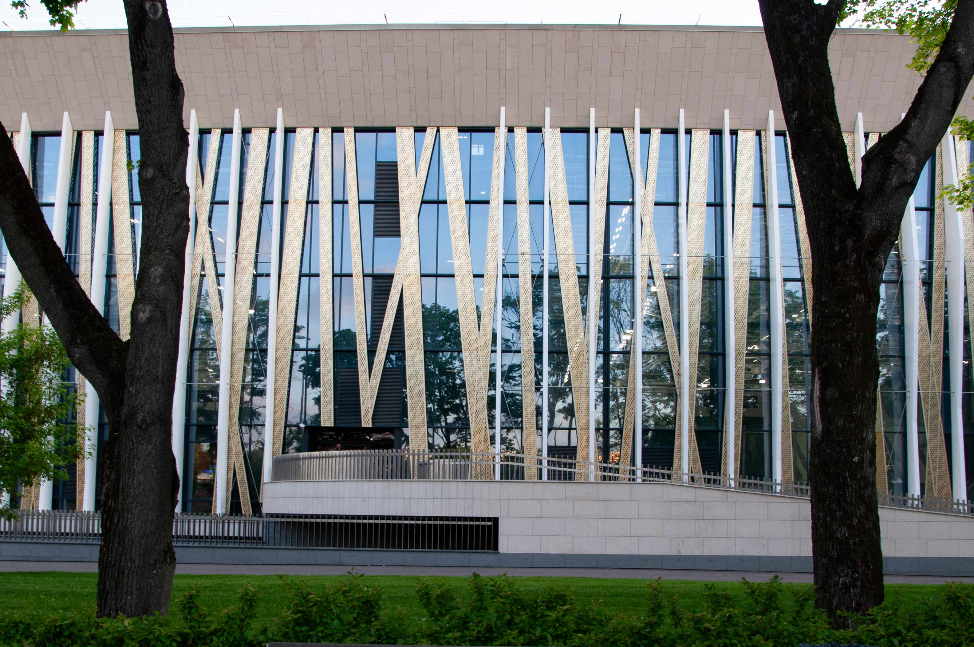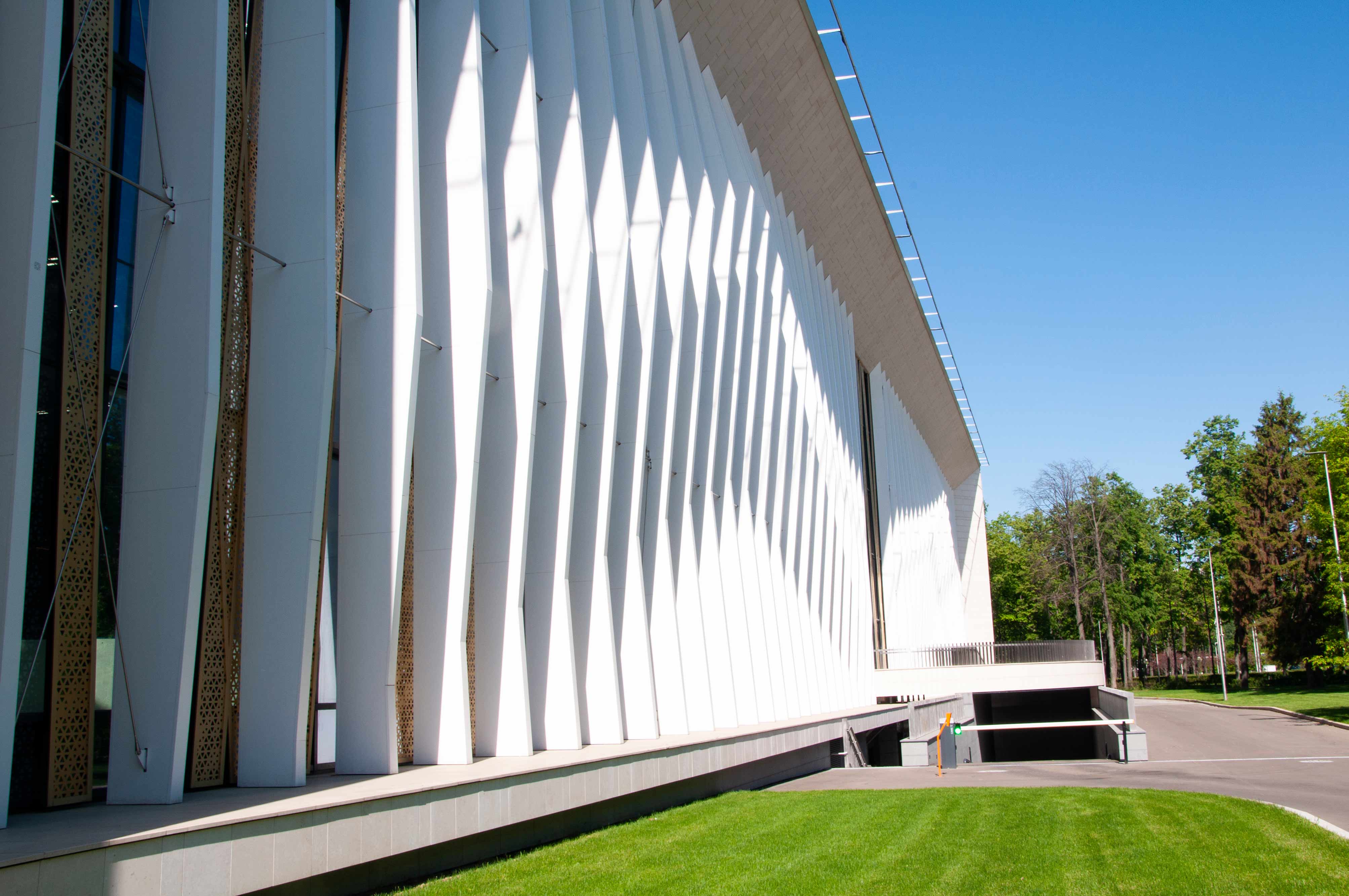 Главный фасад здания ориентирован на аллею, идущую от набережной к Дворцу Спорта. Вестибюль решен в форме ниши с заглубленным в неё пространственной структурой в форме кристалла. Зона спа-центра с бассейном также выделена панорамным остеклением с видом на парк. Вход в зону офисов осуществляется с Аллеи Славы с противоположного симметрично решенного фасада. Все офисные помещения запроектированы с видом на Москва-реку.