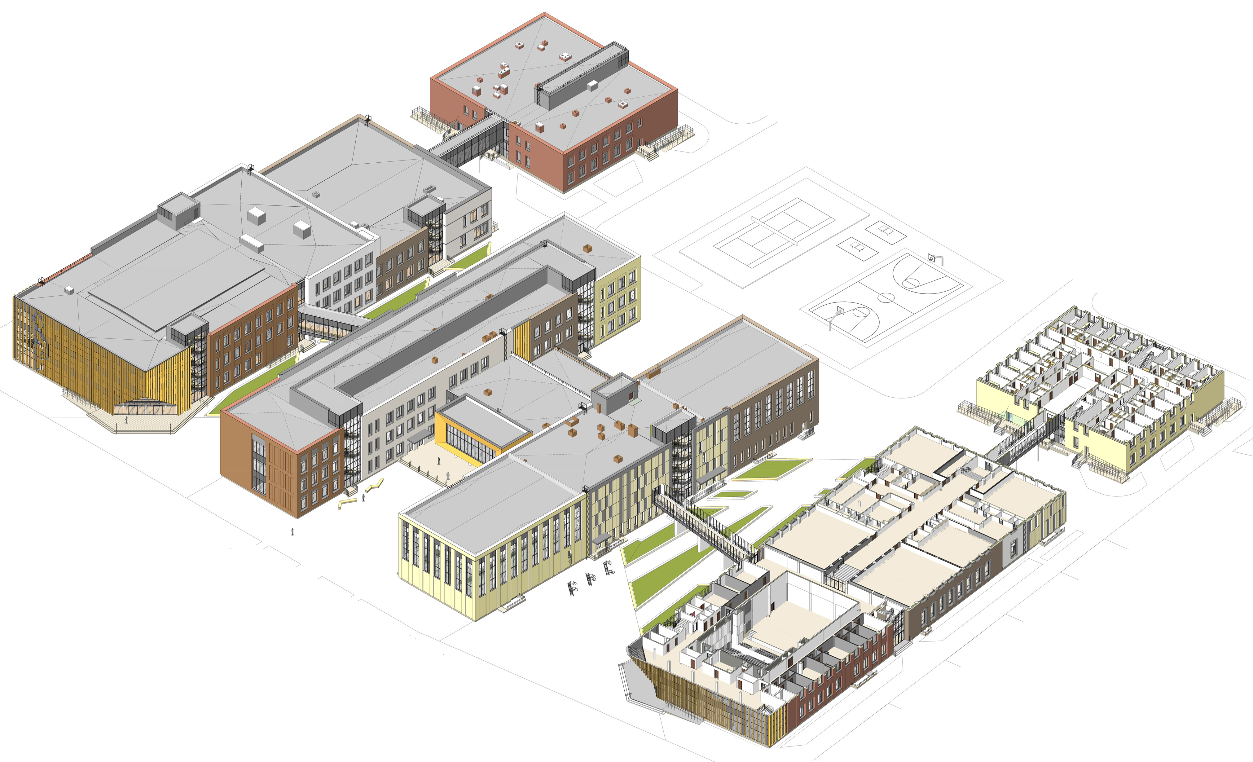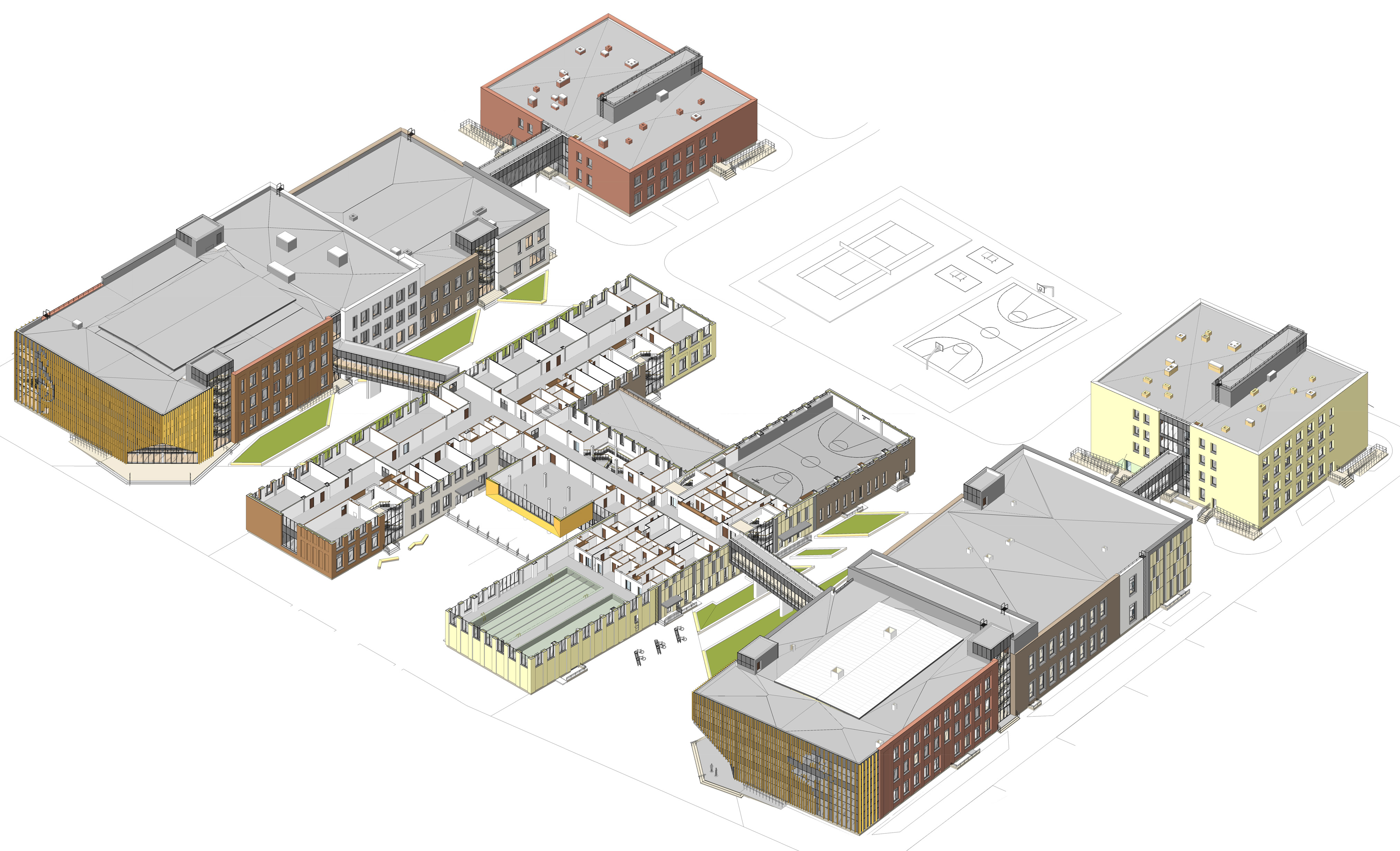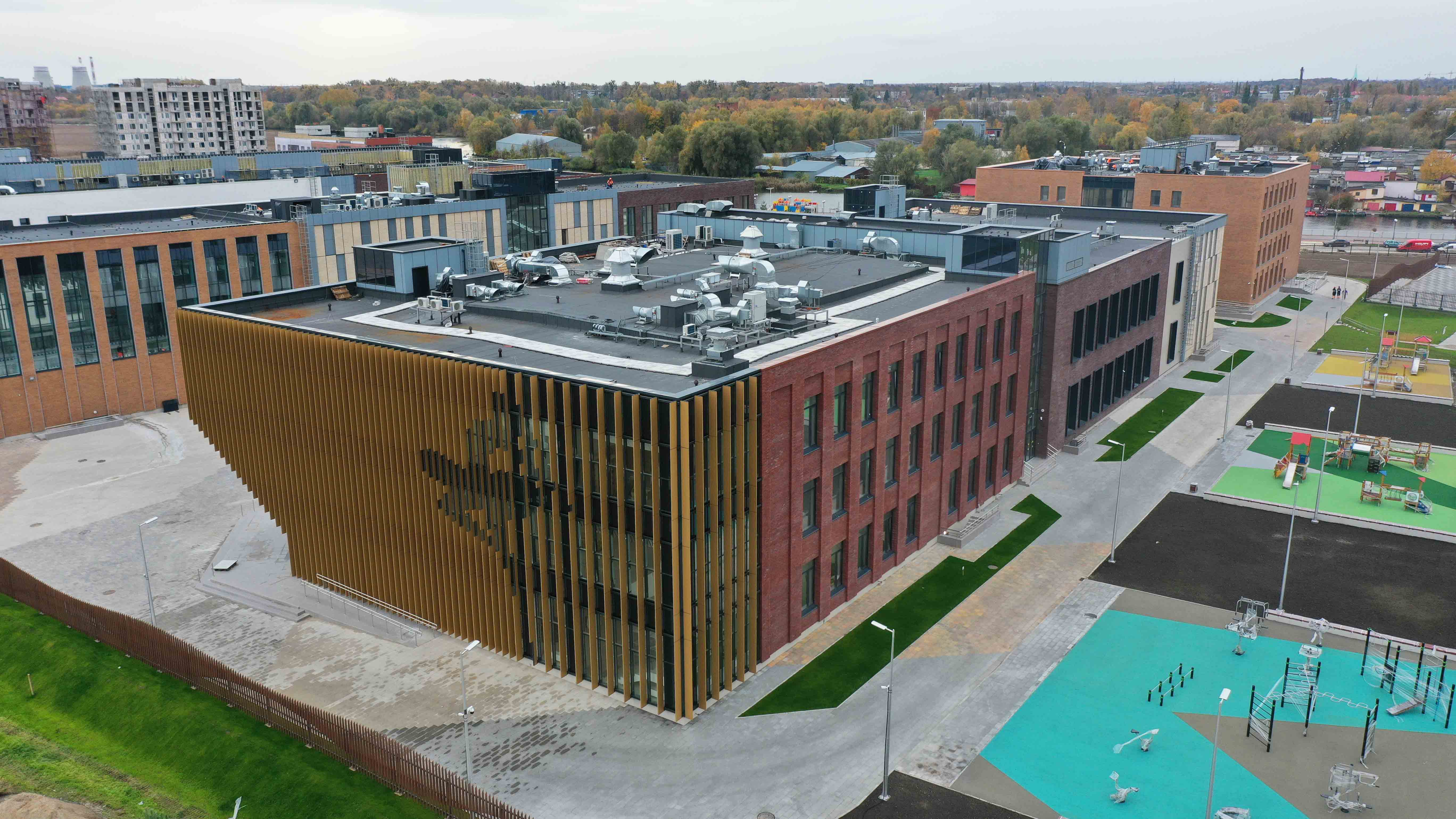 Корпуса образовательной части и интернаты связаны наземными переходами.