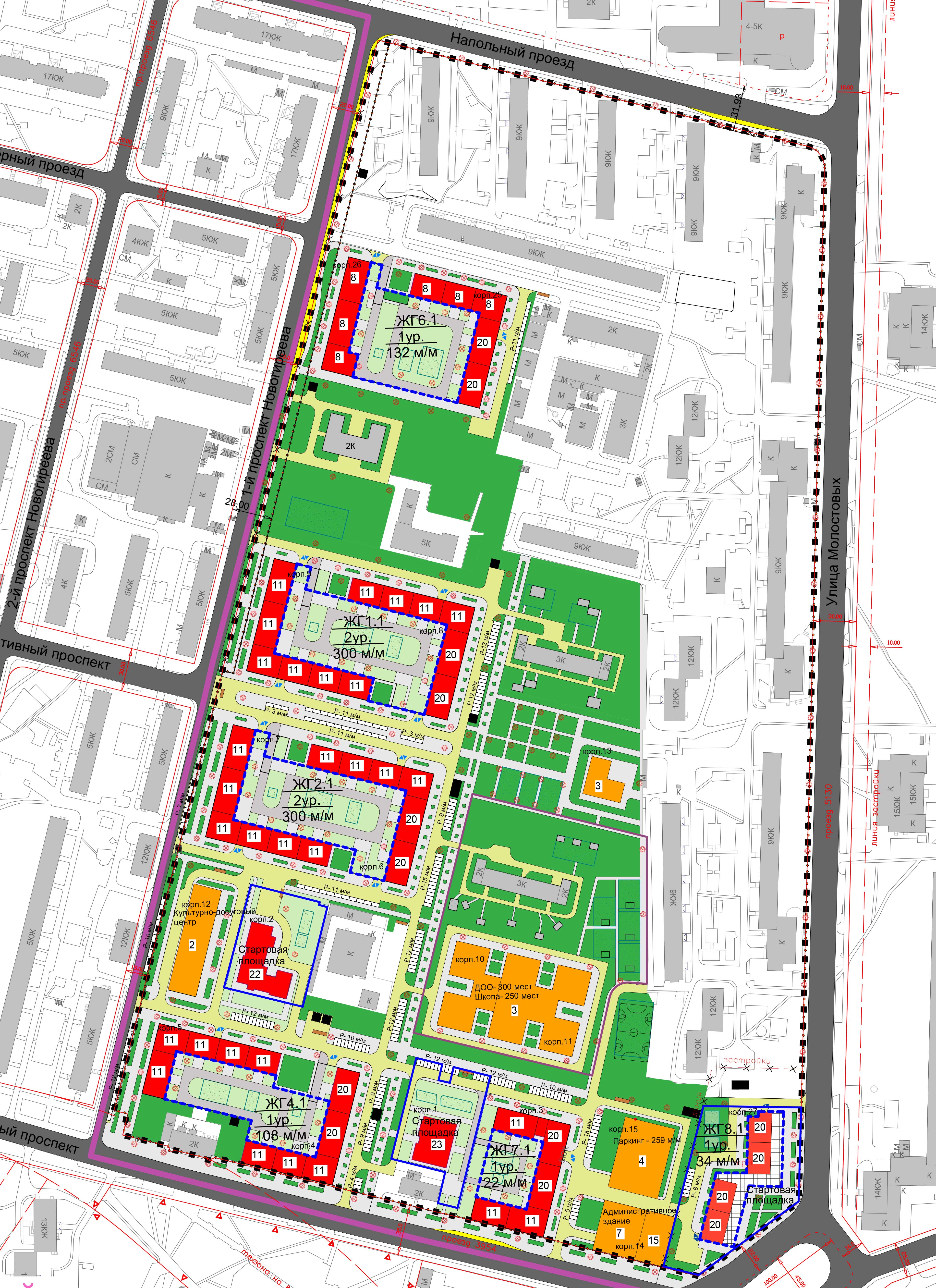 В составе комплексного архитектурно-пространственного решения жилой застройки разработаны: